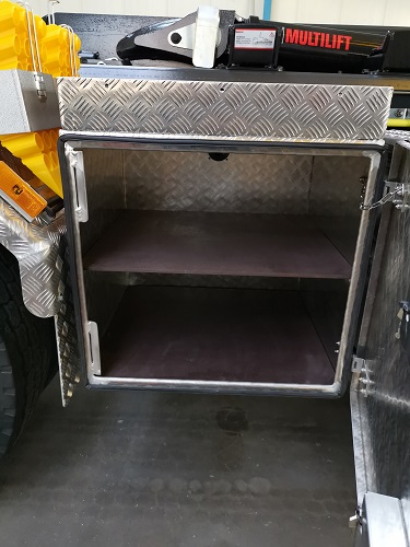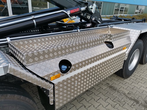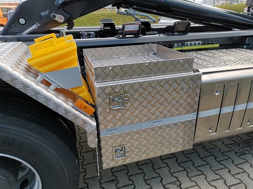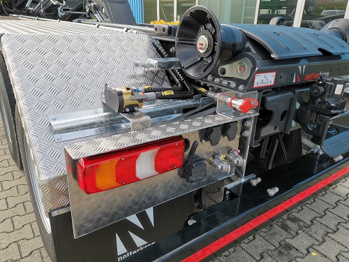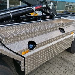 Kipperhydraulik über Multilift Steuerblock, Zusatzhydraulik ab 40 l/min am Heck mit Cejn Schnellkupplung, Spezialwerkzeugkiste mit aufgeschweißter Wanne, Achsabstützung gemeinsam bedienbar