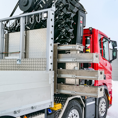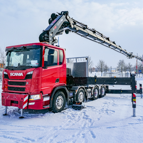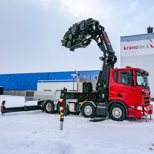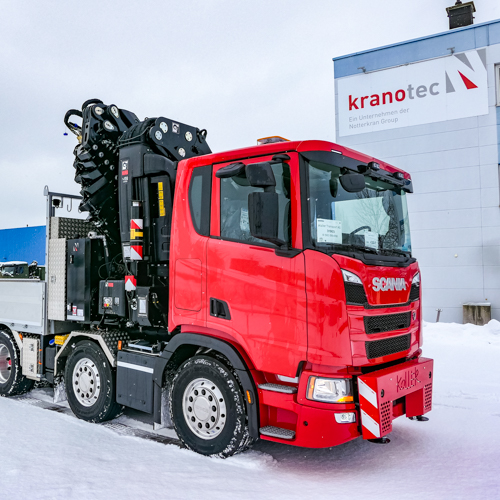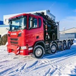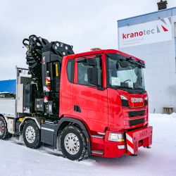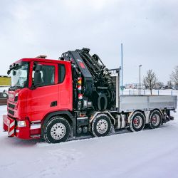 Kranotec Kranmontage auf Scania R560 8x4 mit HIAB IQ1188 HiPro E9 Jib 155Q-6 hinter der Kabine. Frontstütze mit 2 Zylindern bis 25t. Pritsche KTL SF 4200 / 600. Mit Stahlboden und diversen Ladesicherungsmöglichkeiten. Heckbalken hydraulisch ausfahrbar mit Pneumatischem Unterfahrschutz. Rückladen überfahrbar. Schneekettenhalter, Y- Kisten ausziehbar, Spezialwerkzeugkiste zwischen Kran und Stirnwand mit ausziehbaren Schubladen.